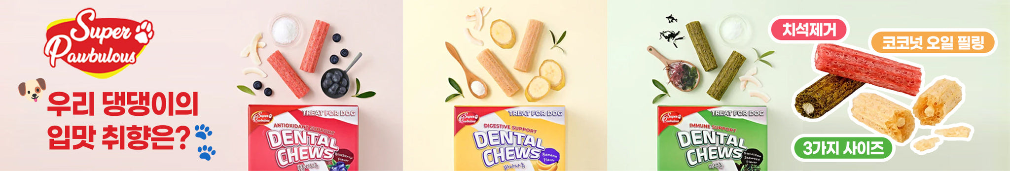 [SUPER PAWBULOUS] 바나나츄 강아지 덴탈껌 (25개/50개입) Banana Chew, Digestive Support, Dental Care Dog Treats 50 Pack (S/M/L)